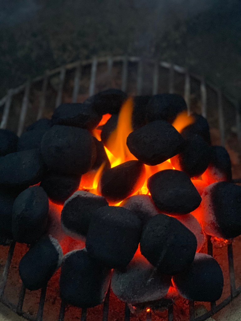 Die Glut beginnt ja schon beim Anzünden – eigentlich schon davor beim Schichten der Kohle. Da erzählen immer alle, man müsste die Grillanzünder nur unten platzieren, damit die Kohlebriketts von unten nach oben durchglühen. Für mich funktioniert es aber besser, wenn ich die Anzünder zwischen die Briketts stecke…