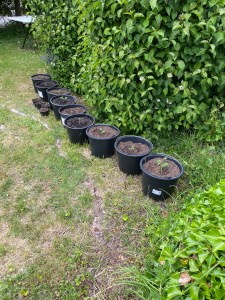 Also war ich clever und habe einfach 1-Euro-Eimer mit 12-Liter Fassungsvermögen genommen. Immer noch ne ziemliche Investition. Als nächstes muss ich Rankstangen besorgen, aber darum kümmere ich mich wohl nächste Woche. So sieht das jetzt jedenfalls aus