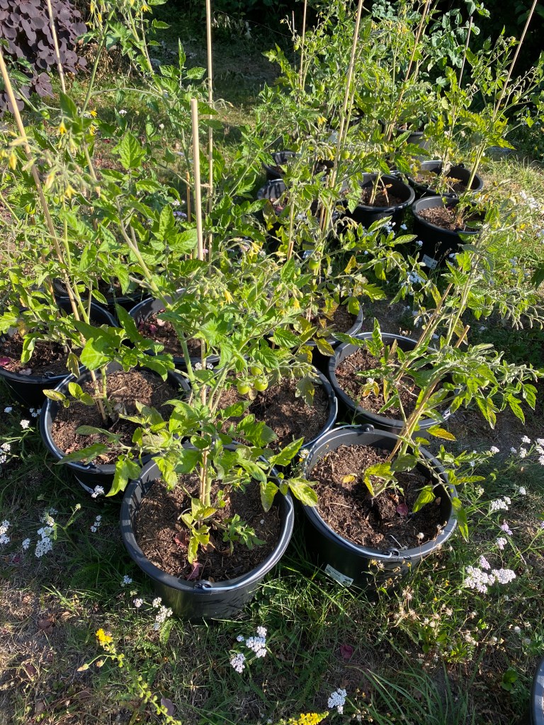 Die Tomatenpflanzen wirken gelblich und ungesund, aber sie tragen dennoch ebenfalls Tomaten, wenn auch nicht so viele. Ob die Tomaten der Pflanzen ohne vor Staunässe schützende Grundierung reif werden oder anders schmecken, werde ich berichten, wenn es soweit ist. Im Moment „leben“ sie aber noch…