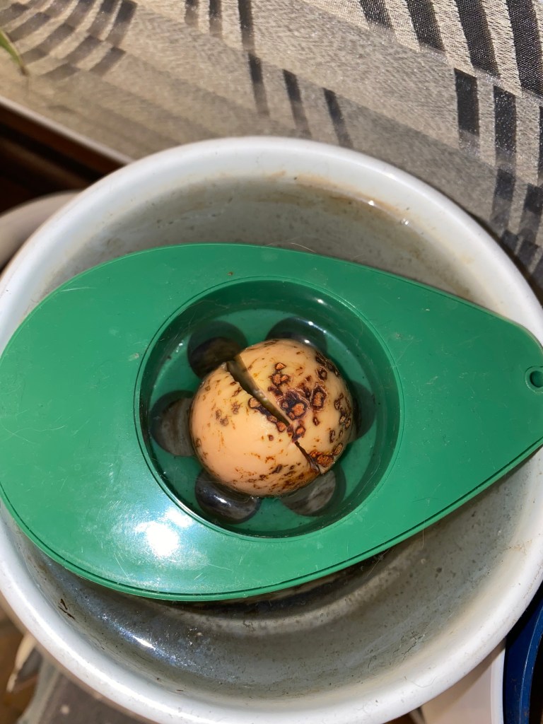 Nun habe ich meinem Freund Max von unserem Problem mit den Avocado-Kernen erzählt, als er mich neulich besucht hat. Ich meinte „Ann-Kathrin kriegt es einfach nicht hin, den Kern im Wasser wurzeln zu lassen.“ Daraufhin empfahl mir Max den Kauf dieses Avocado-Schiffchens*: „Bei mir hat das sofort geklappt!“ – allerdings sei die gezogene Avocado danach eingegangen. Dies hatte er übrigens mit der Kollegin gemeinsam; gefühlt wächst die Avocado nur bei uns. Jedenfalls war Ann-Kathrins erste Reaktion, als ich ihr von diesem AvoSeedo erzählt habe: „Jaja, Max labert nur.“