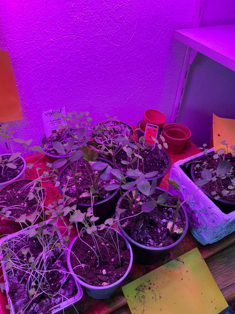 Am besten sind die Erdnüsse geworden. Die Tomaten gehen auch noch. Die anderen Pflanzen sind zu schnell zu hoch gewachsen. Hier habe ich Rucola, Kolrabi und Mangold gesetzt. Das ist, vermutlich wegen des Rotlichts, nichts geworden. Die Stengel sind lang und instabil.