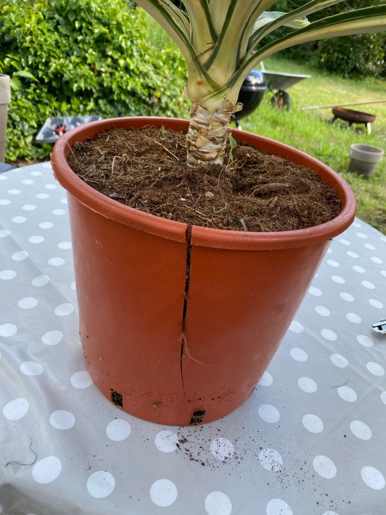 Gerade, wenn man Pflanzen schon größer kauft oder wenn man größere Pflanzen kauft, funktioniert die Methode „Topf eindrücken“ nicht mehr. Mit großem Topf hatte ich bisher immer die meisten Probleme beim Umptopfen.